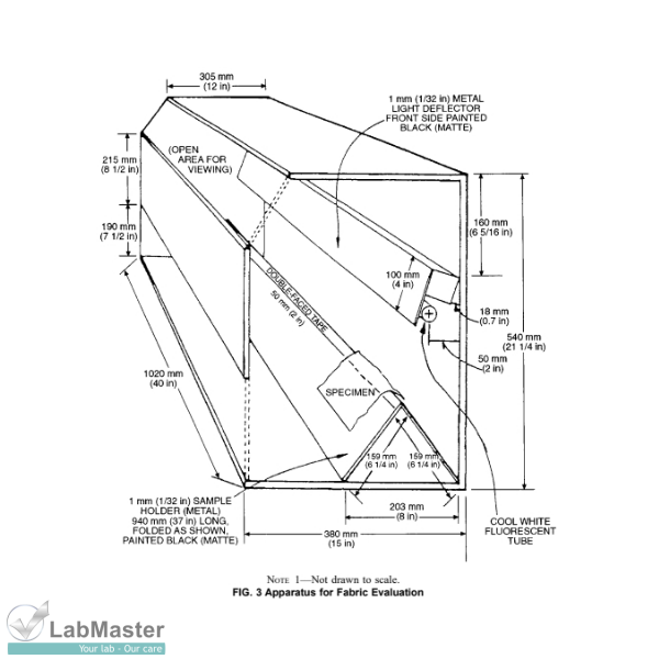 The cabinet is equipped with cool white fluorescent lamps and is designed with standardized dimensions to ensure consistent and accurate evaluation conditions as specified by the standard.