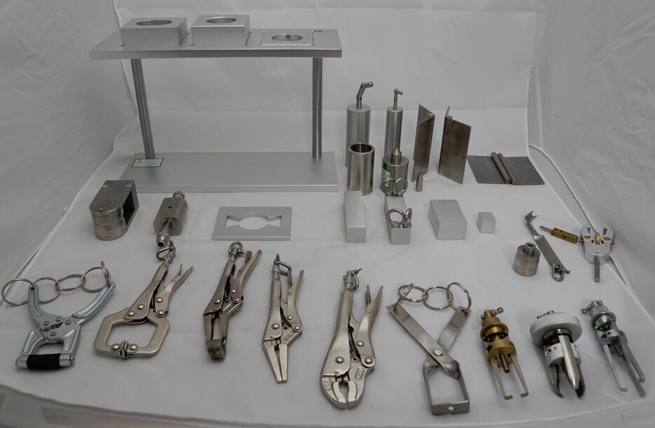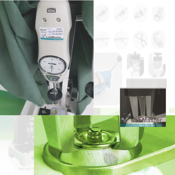 Snap Tester (button pull test machine), to determine the holding or breaking strength of prong-ring attached snap fasteners onto garments or toys, also as a Push Pull Tester for compression and tensile testing of small samples(special attachments are available).